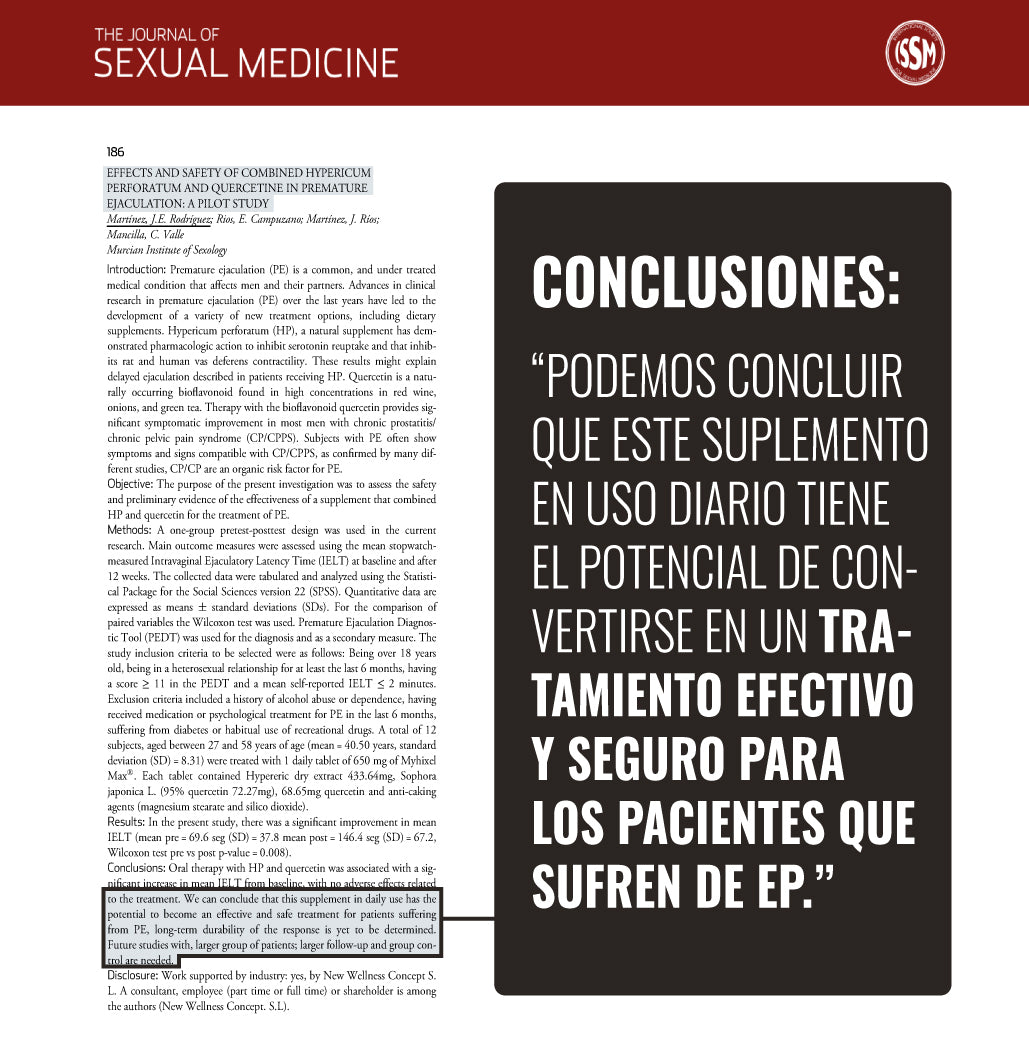 Un estudio científico publicado en The Journal of Sexual Medicine en 2022 (Efectos y seguridad de la combinación de hypericum perforatum y quercetina en la eyaculación precoz: un estudio piloto) destacó el impacto positivo de combinar quercetina y hypericum perforatum en el control de la eyaculación. Esto se atribuye a cómo estos ingredientes regulan los niveles de serotonina, que desempeñan un papel vital en el control de las emociones y el estado de ánimo, influyendo directamente en la salud sexual.