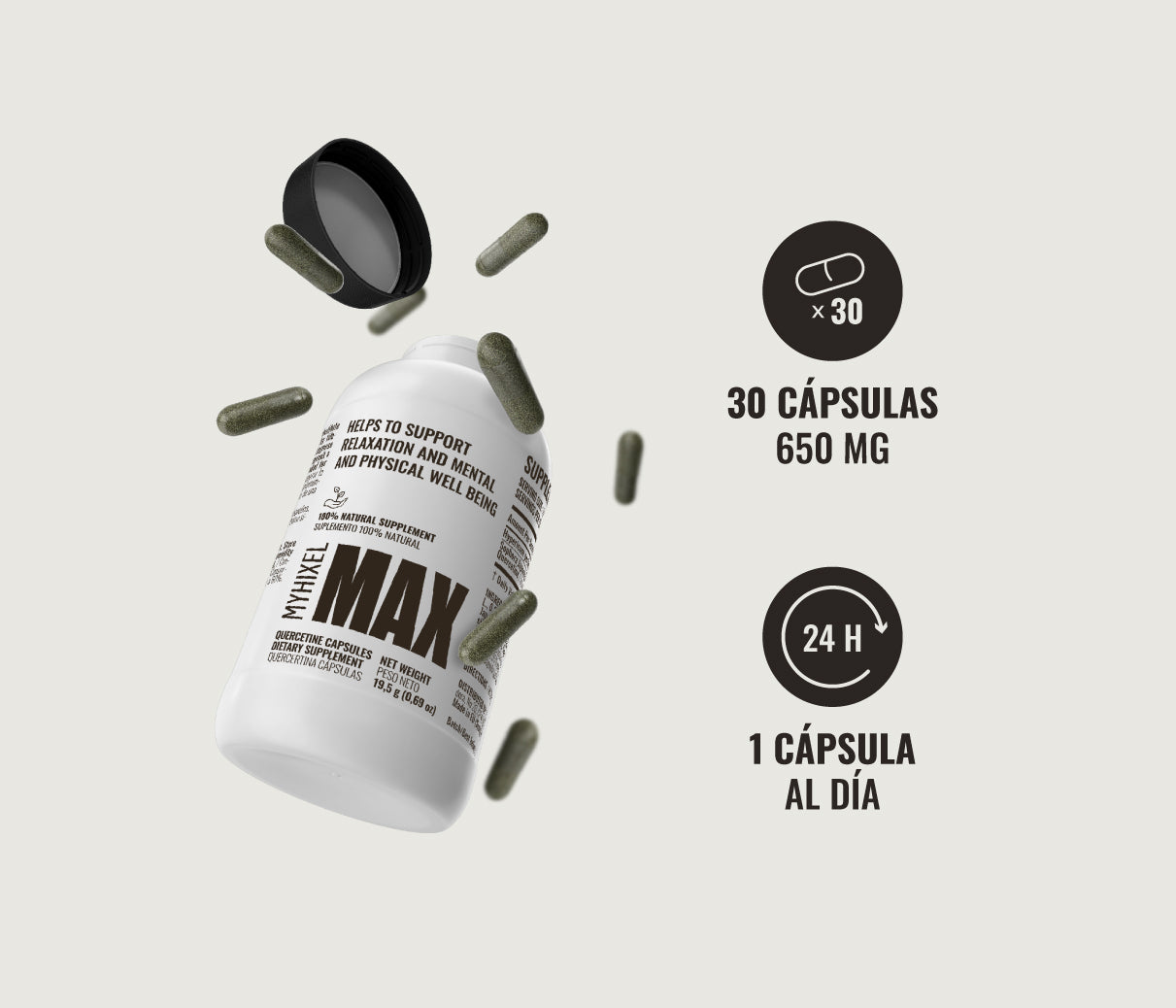 Los ingredientes principales de MYHIXEL MAX son quercetina e hipérico. Ambos provienen de la naturaleza, de hecho, de las plantas. La quercetina proviene de frutas y verduras (cebollas, manzanas, uvas, brócoli o té, entre otros).