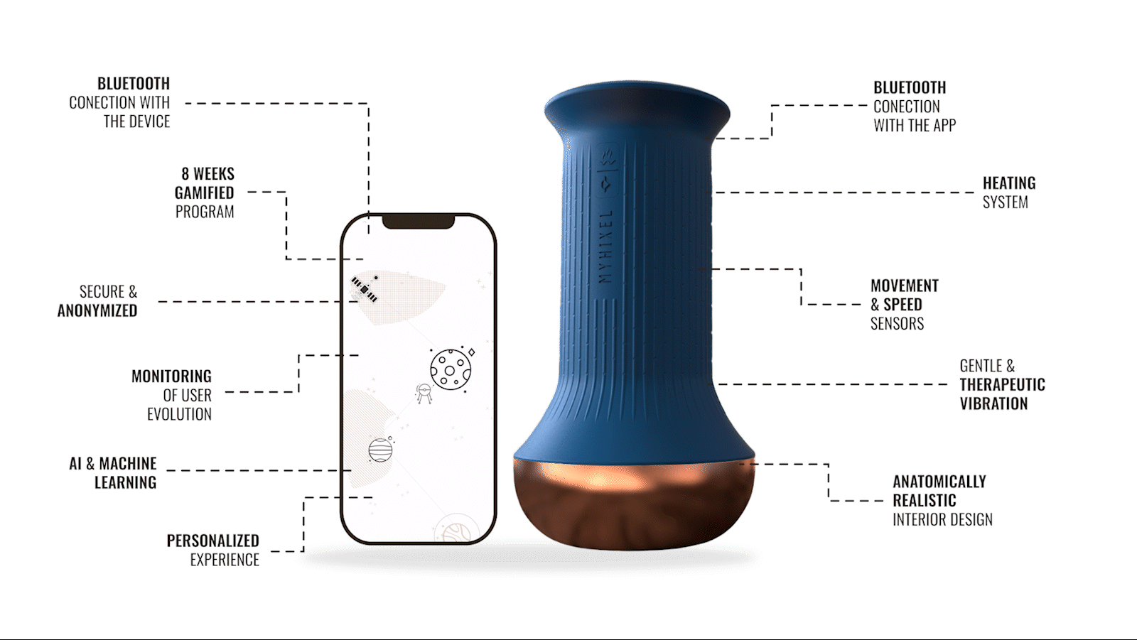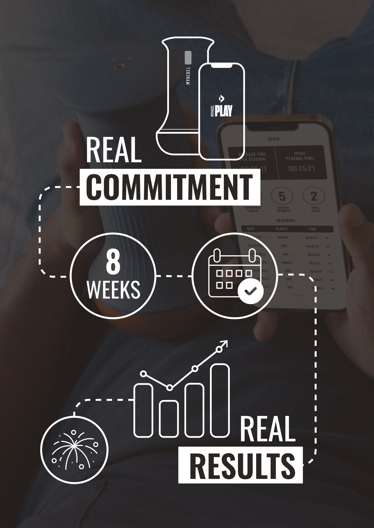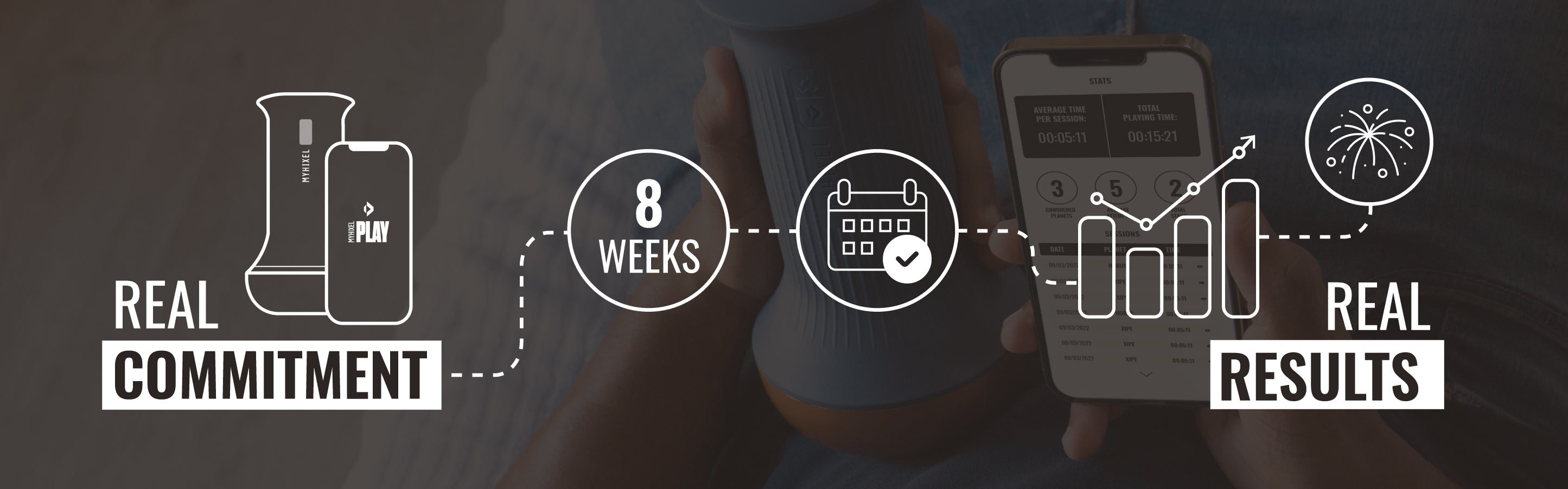 The MYHIXEL Control solution is based on an 8-week training program,which is included in a fun and engaging gamified application. This program is combined with the use of the most innovative anatomically realistic stimulation device, MYHIXEL II Device.